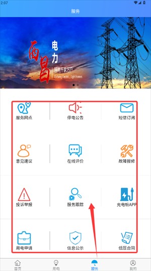 3、切换至服务功能页,可查询网点信息、停电通知等多种电力业务。