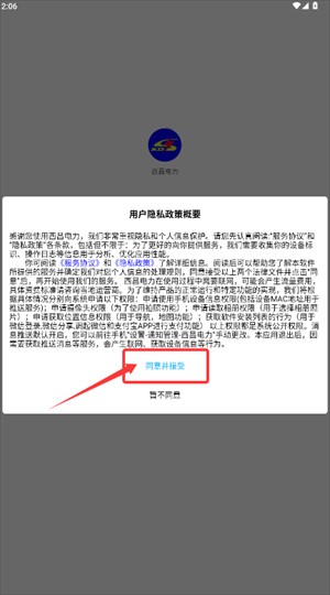 1、启动西昌电力应用,在隐私政策提示界面中,选择“同意并接受”选项。