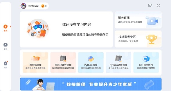 核桃编程,专为青少年设计的软硬件编程学习平台,以动画形式呈现抽象逻辑,提升学习兴趣,激发逻辑思维,内置机器人课堂,简单操作,锻炼动手能力,让孩子在编程中展现创意。