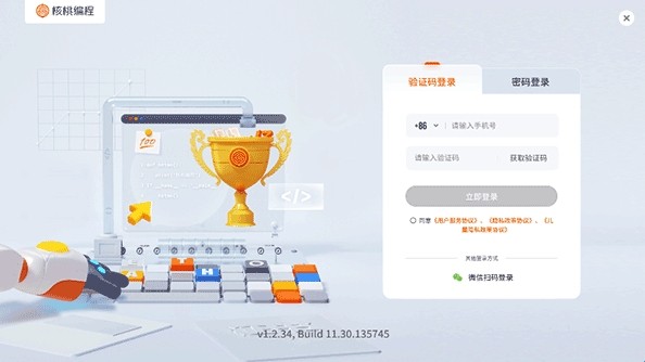 1、核桃软硬件编程App无论在安卓手机,还是安卓平板上都可以安装使用,使用时使用手机号、账号密码或者微信扫码进行登录使用