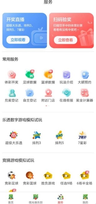 1、打开软件来到服务界面,点击右上角的扫码验奖。