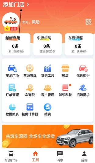 1、进入途众好车App,点击工具进入功能界面,再点击顶部的添加门店;