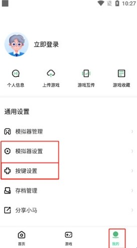 打开在本站下载的小马模拟器手机版,点击进入首页,选择我的,点击模拟器设置。
