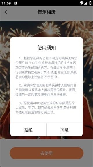 4、阅读使用须知后点击同意,再授权应用使用照片进行智能生成。