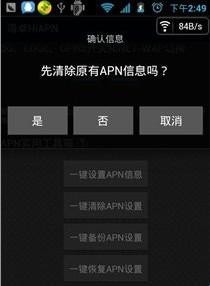 点击之后,软件会提示是否清楚原有APN信息,如果在此之前你并未设置正确,那就果断清除吧,免得APN设置太多自己搞混乱了。