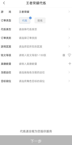 2、输入订单的信息内容,在这里输入代练类型、游戏区服、铭文等级、英雄数量、当前段位等。