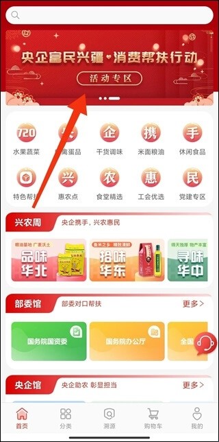 1、进入“央企消费帮扶”页面后,点击首页轮播图,直达活动区为大力支持中国石化推荐产品,可选择“央企馆”——搜索“中国石化”,进入中国石化帮扶产品专区