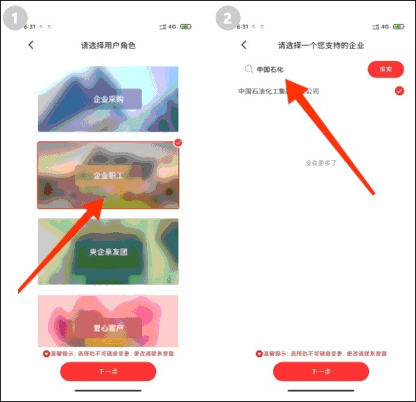 4、为方便国资委了解央企员工参加消费帮扶兴农周活动情况,点击提交后,按照提醒在选择用户角色页面选择“企业职工”——搜索“中国石化”,点击选择,进入下一步,完成,随后进行支付。