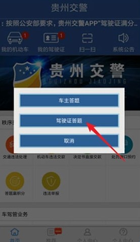 2、在弹出的悬浮菜单中,点击“驾驶证答题”。