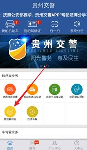 1、首先进入贵州交警123123处理违章App后,使用自己的注册帐号登录,点击页面中的“答题赢积分”项。