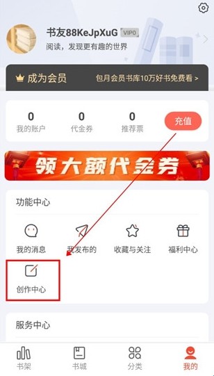 1、进入17k小说网写作app软件,然后依次点击“我的”、“创作中心”;