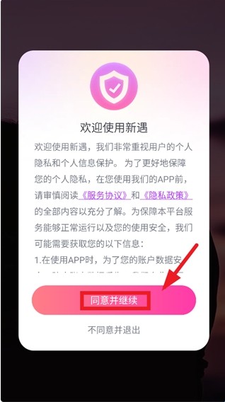 1、打开新遇app,在欢迎使用新遇提示界面点击同意并继续