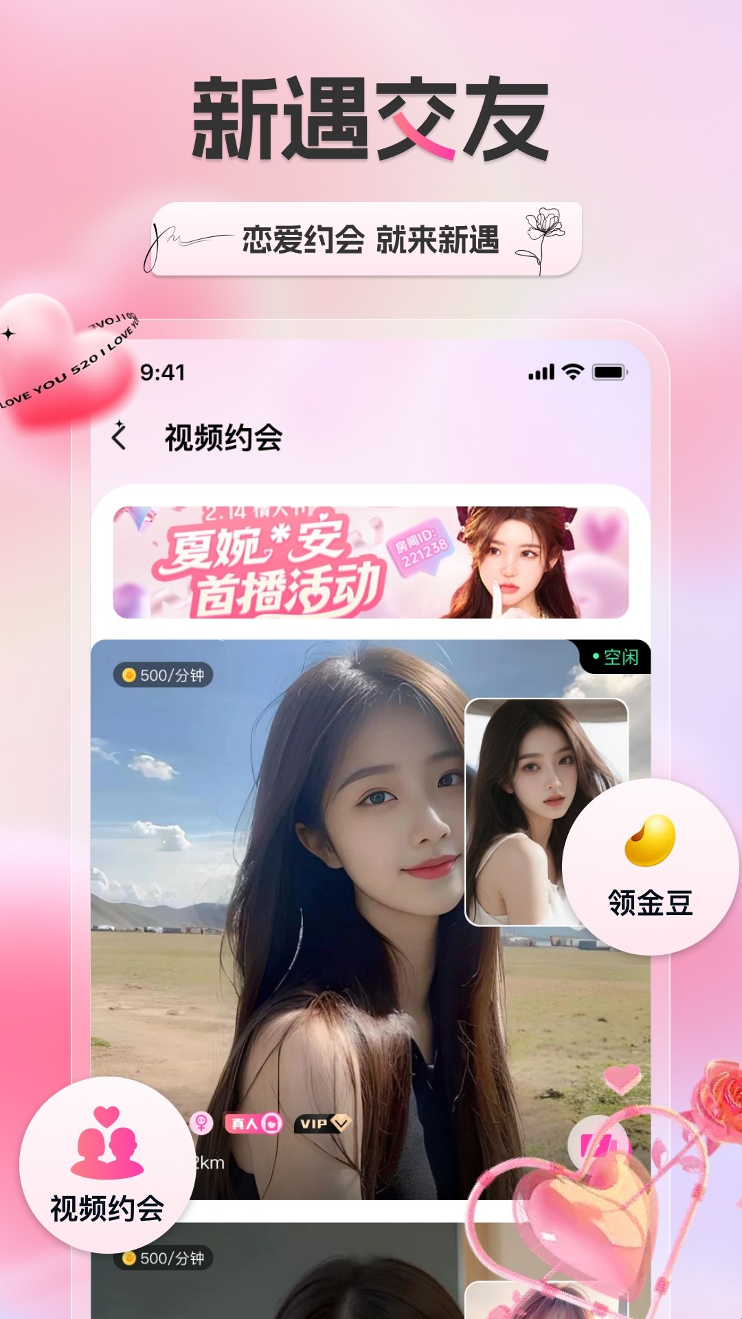 新遇交友,专为年轻人设计的恋爱交友平台。汇聚单身青年,动态广场分享生活趣事,一键打招呼开启聊天。发布照片,寻找有缘人。