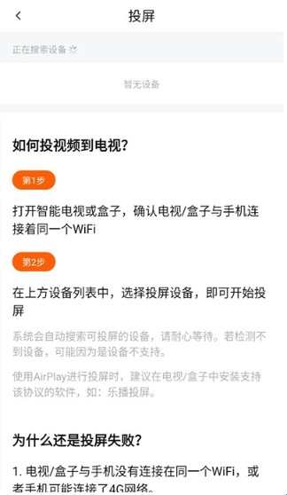 系统会自动搜索可投屏的设备,请耐心等待。若检测不到设备,可能因为是设备不支持;