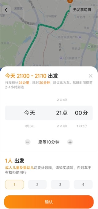 选择顺风车人数,预约出发时间,选择是否接受多人顺风车,点击“确认预约”,等待车主接单。