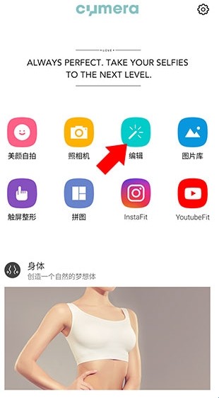 1、下载并打开Cymera特效相机,来到下方主界面点击编辑按钮