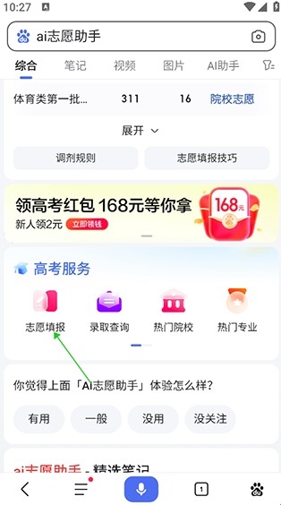 1、直接在百度App中的搜索框中输入“AI志愿助手”,然后就可以在弹出的下拉选项框中点击【AI志愿助手】