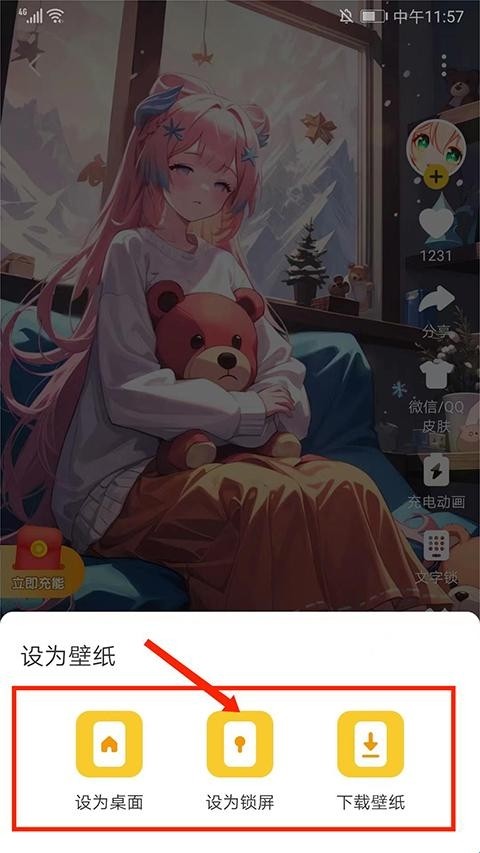 3、进入相应壁纸界面,支持将壁纸设置为【微信/QQ皮肤】、【充电动画】、【文字锁】、【来电壁纸】、【跑马灯】,用户可根据需求进行选择使用,这里选择下方【设为壁纸】选项,