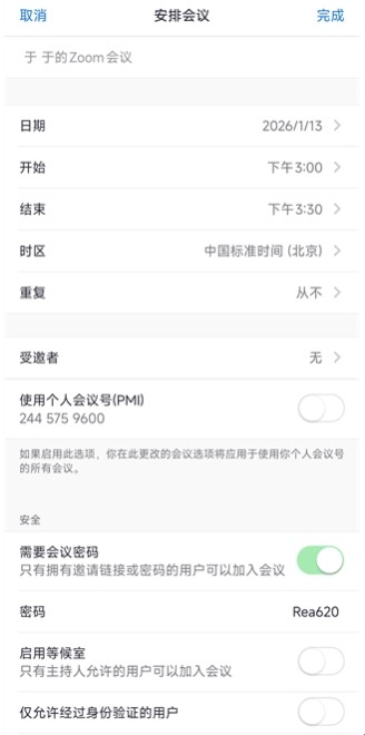 操作:点主页【安排会议】,填写会议主题、时间,开启【需要会议密码】保障安全,添加受邀者后点【完成】即可生成会议。