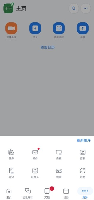 【更多】界面展示【任务、邮件、白板】等拓展功能。
