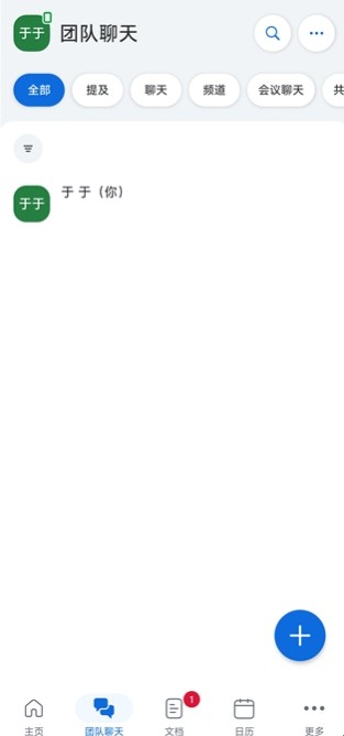 【团队聊天】界面展示聊天列表,右下角【+】可新建群聊聊天,顶部支持【提及、频道】等分类筛选。