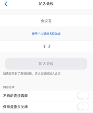 【加入会议】支持输入会议号/个人链接名加会,可提前设置【不自动连音频、关摄像头】。