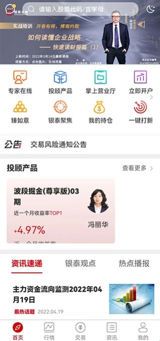 该软件不仅提供了非常专业的专家在线服务,同时还拥有投顾产品、掌上营业厅、银泰聚焦、持仓等功能。