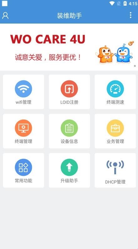 装维助手是一款专为联通提供宽带安装助手软件,为广大用户提供了便捷。如果家里宽带有问题,或者信号不好,可以用它来进行操作,它能够检测出宽带的一些数据问题,快速处理故障!软件内包含了WiFi管理、终端测速(管理)、设备信息、业务管理、loid注册等功能,低成本维护你的网络安全!