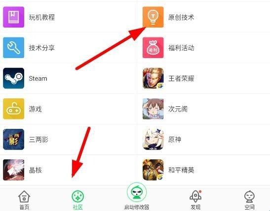 2、用户如果想玩修改的游戏可以通过点击进入社区,选择“原创技术”;
