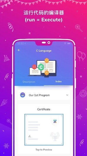 2、在 C Language课程详情页面,查看课程内容及证书预览信息。