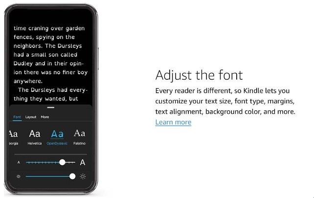 说明:每位读者的阅读习惯都不同,因此 Kindle支持你自定义字号、字体类型、页边距、文本对齐方式、背景颜色等多项设置。