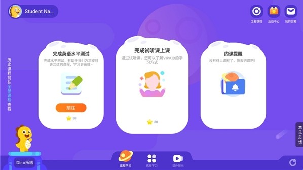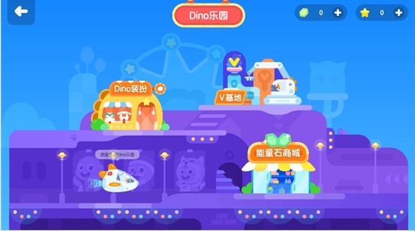 Dino乐园是孩子们的秘密基地,当完成学习任务获得能量石和星星后,可以在Dino装扮中为我换上有趣的衣服,在V基地中建造美轮美负的宇宙城市,还能浏览商城里玲琅满目的学习用品。