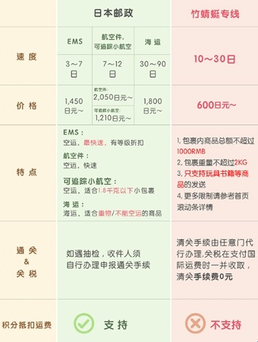 各个物流的时效,特点,通关和关税等信息请参考下表。