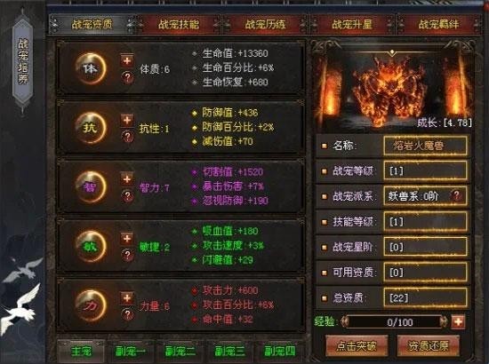 3、资质:每项资质影响战宠15项全属性,初始资质越高,战宠升级所得属性越高。
