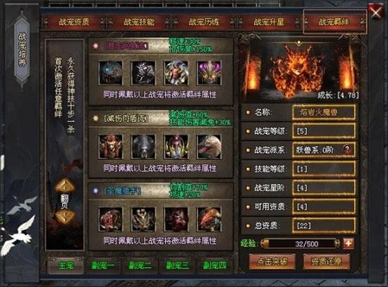 1、战宠4级后开放升星,追求完美的玩家,想让战宠升级时获取更多资质,必须升星。