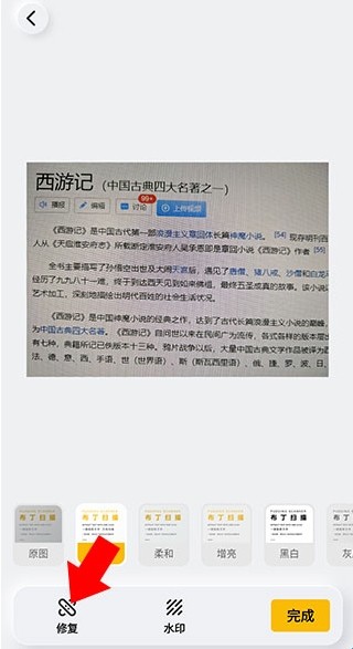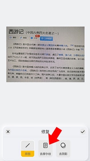 4、来到下方界面后,因为图片此时有很多摩尔纹,看起来观感很差,所以我们使用软件自带的修复功能对其进行修复,点击左下角的修复按钮