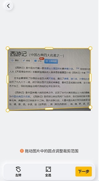 3、我们以文档扫描为例,先拍下使用相机拍下照片,来到下方界面后,我们裁剪好需要扫描的文档,然后点击下一步