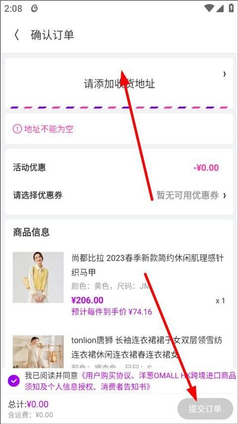 6、进入订单页面,用户需要添加收货地址(收货人姓名、联系方式、收货地址等)、提交订单即可。