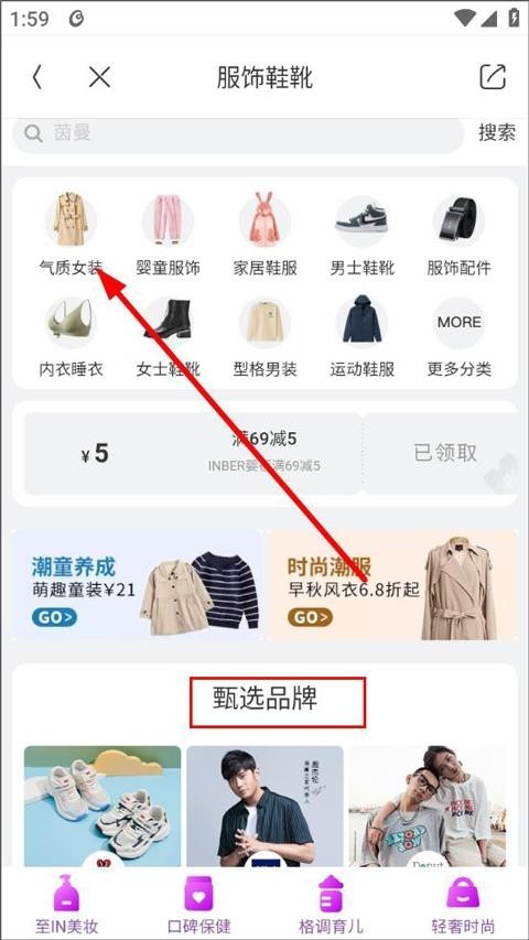2、进入服饰鞋靴页面,用户可按照商品分类和品牌筛选(女装、儿童服饰、男装、配件等);