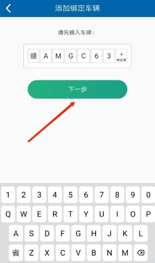 3、进入添加绑定车辆界面,输入完车牌后,选择“下一步”,