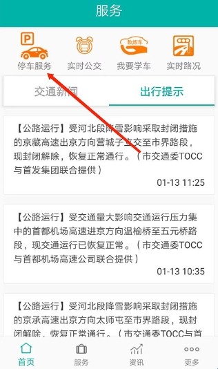 1、打开北京交通App,选择右上角“停车服务”图标,