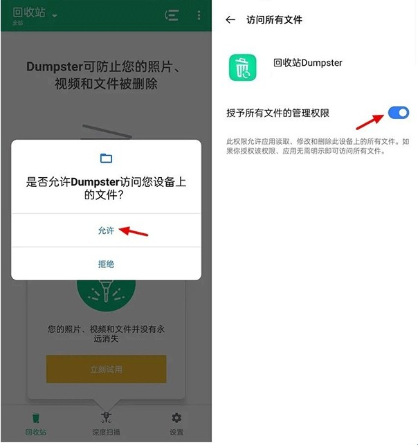 1、首次使用会需要允许「Dumpster」访问设备上的文件,根据提示点击「允许」,再开启权限即可,如图所示。