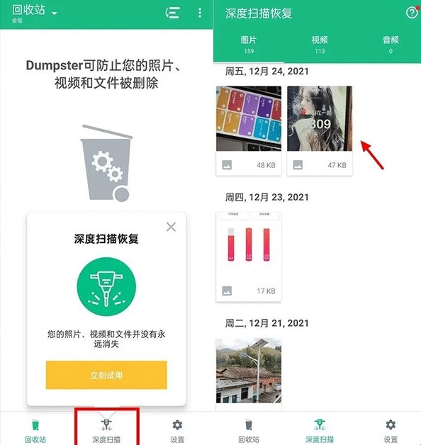 Dumpster数据恢复,一款功能强大的手机数据恢复工具,软件专为安卓用户打造,它可以快速的帮助你找到删除的文件,恢复各种文档内容、图片、视频等。为了保护用户的隐私安全,平台专门设计了多个密码认证,和权限访问功能,防止别人窃取和编辑你的文件内容。