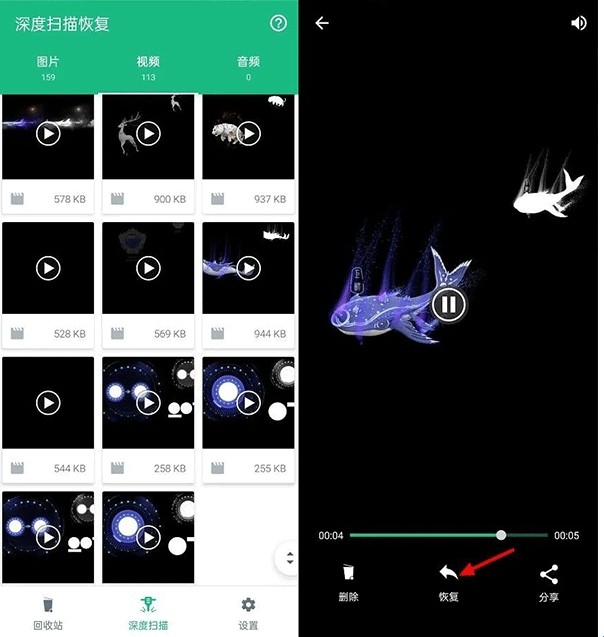 2、进入APP之后,可以看到这款工具界面十分简洁,使用也非常简单,恢复文件功能主要集中在底部中间的「深度扫描」中。打开之后,会自动开始深度扫描,它可以让我们找回曾经删除过的一些文件,主要包括图片、视频、音频,如图所示。
