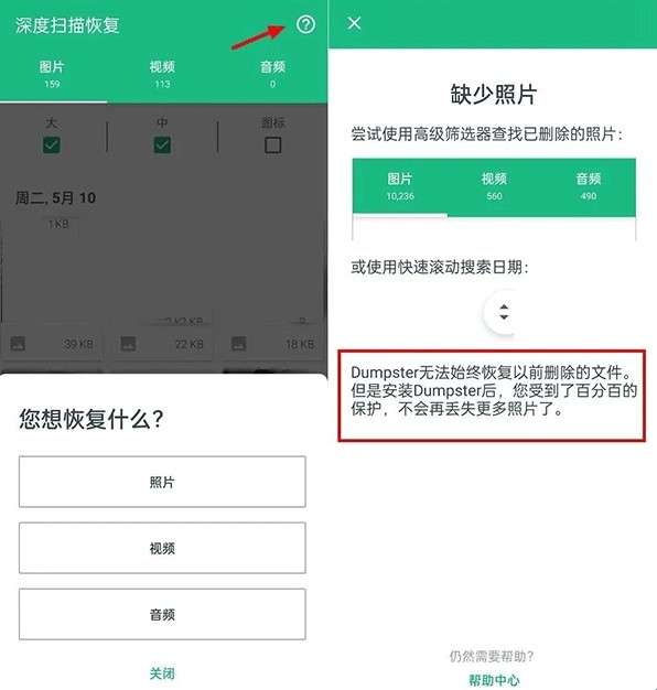 7、最后值得一提的是,Dumpster回收站APP无法保证之前被删除的文件都能召回,但安装Dumpster之后,APP宣称你的手机中文件会受到百分百的保护,不会再丢失更多的文件。