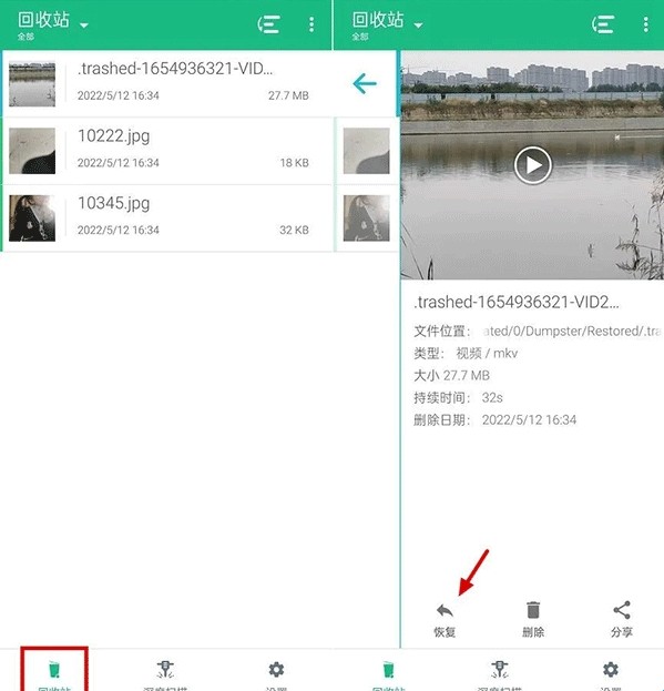 5、其它方面,安装Dumpster之后,今后使用Dumpster删除的图片,可以在左下角的「回收站」中找到,里面可以对再次删除的文件进行恢复,如图所示。