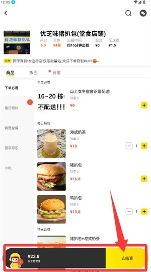 4、进入商家选择菜品并修改份数,点击去结算完成下单。