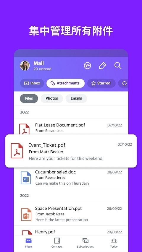 雅虎邮箱,也称Yahoo Mail,一款非常好用的邮箱软件,同时也是安卓设备最好的多个账户的最佳邮箱应用。软件可以使用任何电子邮箱地址,支持自定义设置、颜色。系统会集中管理所有附件,用户可以按照发件人类型寻找信件,轻松整理,快速找寻。