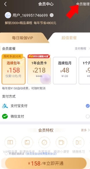 3、进入VIP会员中心界面后,点击页面右上角的会员管理选项,打开会员服务与订阅管理的详细设置页面。