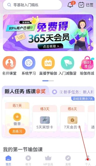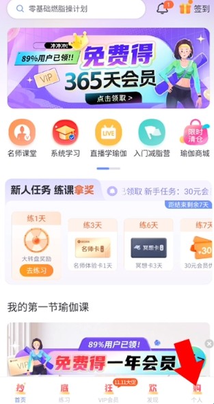 2、首先打开每日瑜伽视频app,在首页浏览各类专业瑜伽课程与服务内容,随后点击页面中的【个人】选项,进入个人中心界面查看专属训练信息。